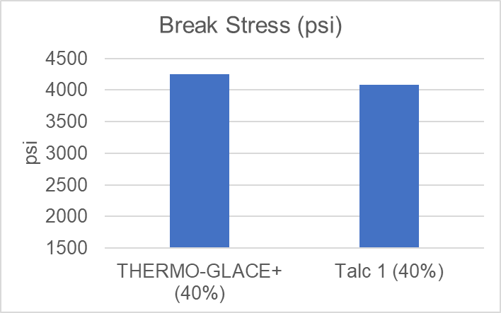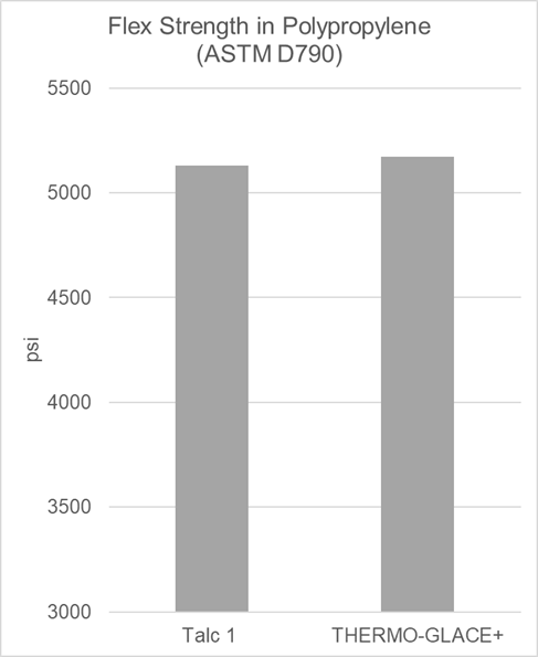THERMO GLACE+ has been extensively tested in many thermoplastic polymers and some thermosets as a talc replacement. The data below, in polypropylene demonstrates that it is an excellent, safe choice to replace fine talcs in thermoplastic polymers.